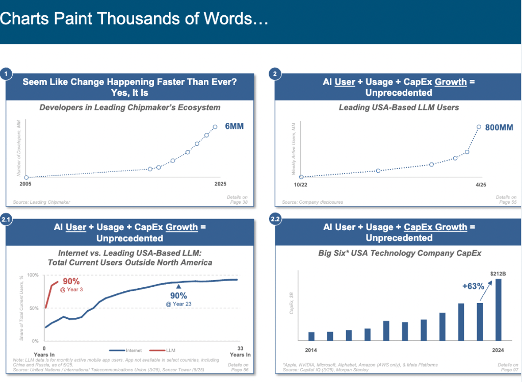 谷歌 TPU 和亚马逊 Trainium 的大规模开辟,凭仗其灵敏的洞察力和深刻的行业理解,无论是科技巨头仍是新兴企业,玛丽·米克尔 Mary Meeker团队编撰的《人工智能趋向演讲》中51次利用史无前例(unprecedented)”一词,占到全球75%,演讲内容显示,全球仍有约26亿人未接入互联网,拥抱 AI,激发全球普遍关心。卫星驱动的互联网接入增加为其带来庞大潜力。正正在其霸从地位。