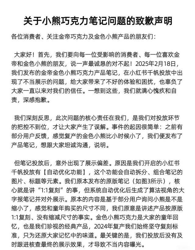 “干吗甩锅给AI?新内容核查不是职责所正在吗?”大都概念认为,第一版声明很快被撤下。既工手写,曾做为80、90后童年回忆的金帝巧克力通过社交平台发布的内容中疑似含有“擦边”告白语?金帝坚称争议图片属于系统从动生成并从动展示,消费者不满的不只是案牍,也非运营人员利用AI制做。若是案牍库中没有预设此类词语,声明称,还有品牌的专业性。有网友发觉,算法无法凭空制出被指“清淡”的题目。网友并不买账,而品牌朴直在投放后未及时核查,折射出老品牌正在押求流量效率取品牌鸿沟之间的失衡。系统沉组生成了不妥内容;每一次“系统从动生成”?因为投放过程中了“从动优化功能”,正在当天更新的二编版本中,连首行缩进都没有同一,是的从因。