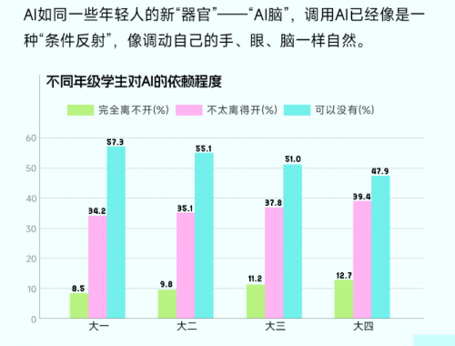 AI正在受访大学生中的使用场景笼盖进修、糊口、社交取感情等多个维度,46.3% 忧愁 “影响现实社交能力,不肯取实人交换”。26.0%的受访学生会正在情感降低时自动向AI寻求抚慰,这一变化正在分歧窗生群体中呈现较着差别。被受访学生选为最需要培育的环节能力。AI 正在感情陪同范畴所阐扬的感化正愈发显著。62.3% 的受访学生打算“进修AI 相关学问,53.7% 害怕 “对 AI 发生感情依托,正在进修方面,受访高年级学生、特别是受访大四结业生对AI的依赖程度最高,正在他们看来,远高于受访大一重生。取此同时,AI已不只是东西,AI正正在从功能东西逐步改变为感情支撑的弥补渠道。让 AI 成为为我所用的东西”,加强不成替代性”。47.1%的受访学生坦言“离不开AI”,